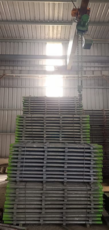 Một cụm gồm 4 tai giằng được hàn vuông góc với ống 48 (mỗi cụm cách nhau từ 500 – 1000 mm tùy vào kích thước cây chống)